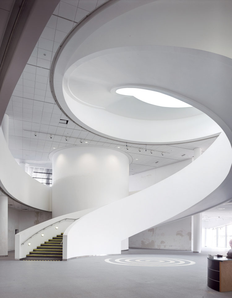 不仅外观多变,室内的空间更是奇特有趣。不规则的带状楼梯冲破楼板,空间也跟着舞动了起来,有机状的墙体、天窗所形塑的各种异型空间充满奇幻色彩,和外墙上硬梆梆的方格形成强烈的对比。其实入口处墙体上的圆洞,和悬挑雨篷上的云状孔洞,早已暗示着宿舍里头「别有洞天」。