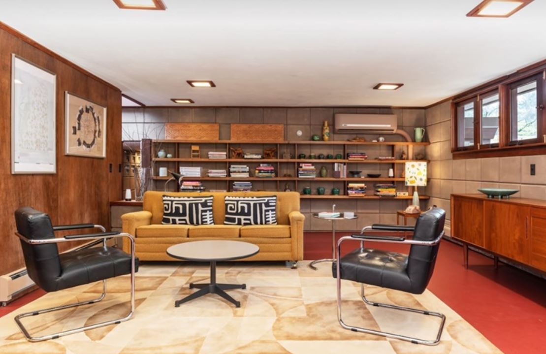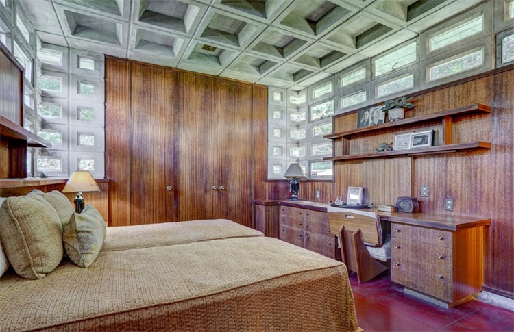 这座占地1,406平方英尺的房屋位于超大的0.73英亩城市地段,具有L形的平面图,并具有Wright的许多标志性细节,包括由Wright设计的原始家具,原始纺织品以及带有辐射采暖和通风的切诺基红色混凝土地板。地板上的空气管道。房屋的独特设计可过滤大量自然光,并具有350个固定且可操作的独立玻璃窗。还设有壁炉,书房和车棚。