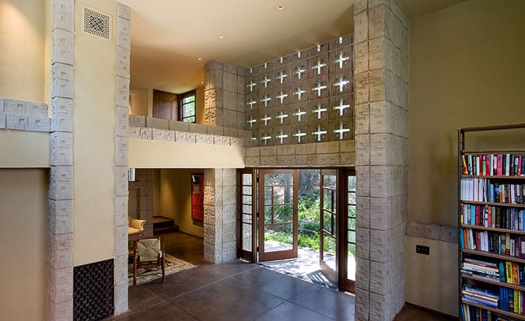 赖特使用了厚重的预制混凝土块来建造这座别墅,在桉树浓荫与茂密植被掩映之下,混凝土的工业性被转化为类似于石头的天然性,米拉德住宅仿佛是丛林中不知何时建造的古代庙宇。很难让人相信的是,这个别墅居然位于美国人口最为稠密的加州帕萨迪纳,不远之处就是著名的玫瑰碗体育场。赖特对米拉德住宅格外偏爱,他非常清楚这个建筑背后的价值:“最终,这个小住宅中开始了一种真正的建造方法i这是建筑的‘编织’,任何人都不会用错;这里有自然对做作、虚假或者是无知狂妄的拒绝。也正因为如此,赖特声称,如果需要选择的话,他宁愿设计米拉德住宅,而不是罗马的圣彼得大教堂。