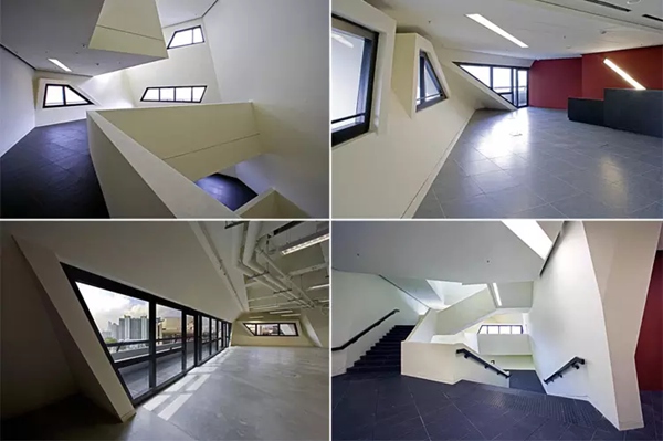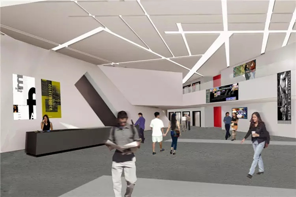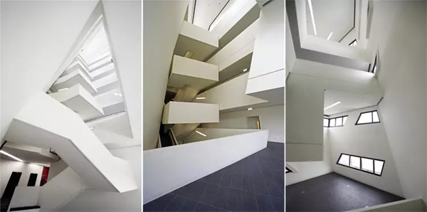 中心还包含了多种设施:一座多功能剧场,声音舞台,实验室,教室,展厅,咖啡厅,餐厅以及多个抽象的“交互空间”,比传统通道开阔,却比正规教室更具亲密性。设计这种“交互空间”是为了鼓励即兴的想法交流和随意性的合作。而充足的自然光线倾斜而下,穿透到更远的地方,似乎增强了这种无极限的创造精神。