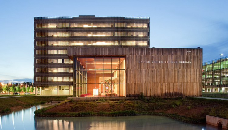 为了确保人口普查工作的顺利进行,美国人口普查局每十年要增雇三分之一的员工才能满足基本规模的要求。SOM事务所设计中标的总部大楼,坐落在华盛顿市区附近休特兰联邦中心约323700平方米的森林区内,该项目精心地将有关企业办公场所设计的当代思考应该用到政府部门中去,并且使之能够适应每十年增长的使用需求。