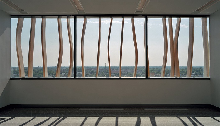 总部大楼向内的立面摒弃了遮阳装置。整个立面由饰有百叶状纹路的玻璃幕墙构成,并策略性地间隔设置了凸出或凹进的大窗户。这些大窗户镶以巴西重蚁木窗框,对应了工作区辅助空间之所在,如休息室、茶水间和会议区。尽管窄条形体量本身已然很适于采光,通过这些大窗户所获得的日光和庭院视野则更佳。