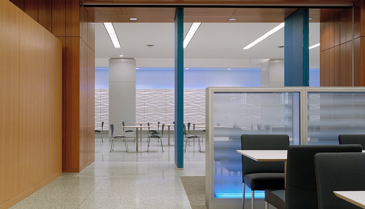 团队还提出了可增进工作区域间相互连接的概念方案。为了在机构中创建出一种凝聚感,SOM将餐厅、健身中心、医疗室等社区空间沿着内部主通道排列。这条被命名为“内街”的通道在员工们需要各种服务时将他们引向这里聚集起来。解决方案还重申了这个更大建筑的主题。“内街”可通往那些最显眼舒适的房间—餐厅、会议中心、礼堂,它们从大楼中心分支出去连接了周边景致,从那里可尽情赏阅户外美景。