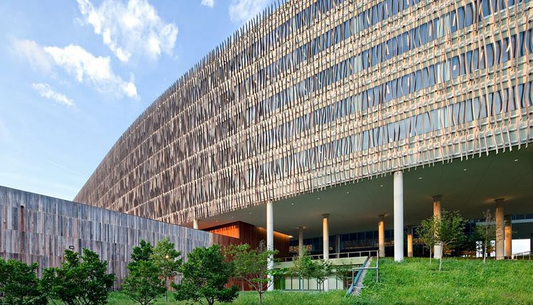 办公用地进一步消解了建筑与场地间的界限。朝向场地外部的立面覆有16000个航海级鳍状橡木薄板,其大小与间距与人的尺度相匹配,远观像一个巨大的百叶窗。绿色镀锌预制窗下墙与带状玻璃视窗位于鳍状木薄板之下,与周边树林的色调相呼应。同样地,藤蔓爬满了停车场周边的铁丝网,为车库遮上了一层生气勃勃的面纱。