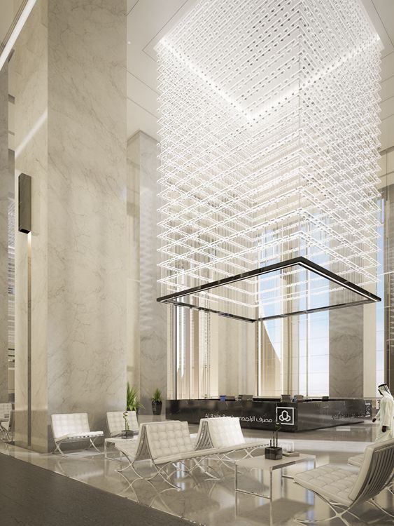 建筑形态通过编程生成,通过增加楼层间的服务夹层和在大堂与祈祷空间之间嵌入体验空间以增进银行的运转。在这栋257米高的塔楼中,标准层的层高为5.5米,而包括了祈祷室在内的大堂,层高更是飙升至50米。