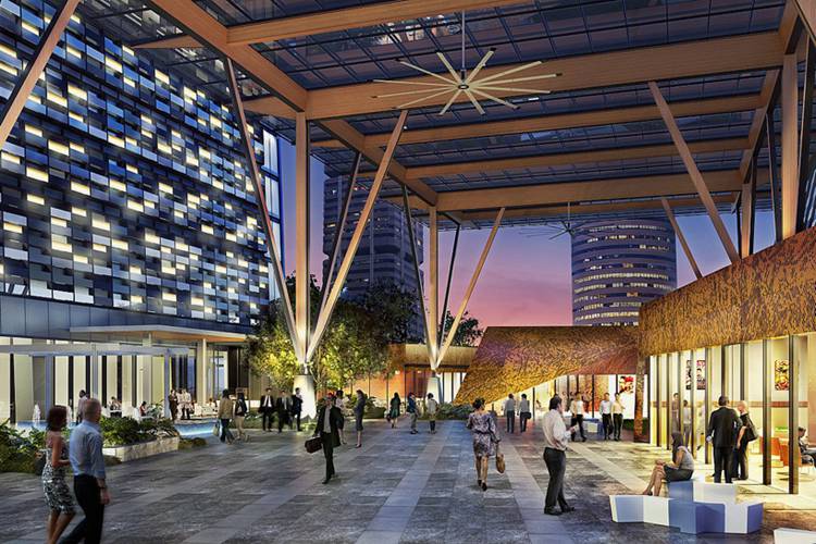 6层高的裙楼设有多层停车库、商业、餐厅、娱乐设施、以及酒店、办公和住宅的大堂及配套设施层。大型公共组成部分包括一个“城市空间”(city room),内含公共艺术品和户外表演区、首层商业,以及与现有大众捷运车站(MRT station)相连的地下步行网路。