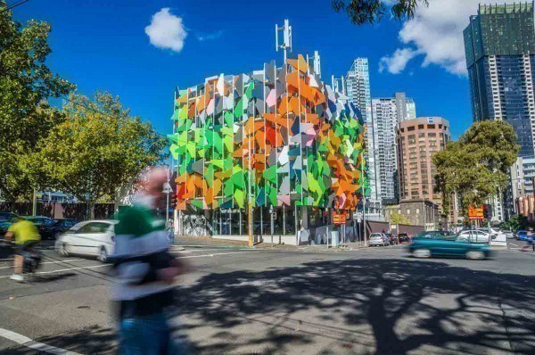 墨尔本皇家理工大学在墨尔本的设计中心有盘状式的喷砂玻璃外牆,白天时光线会像直立式百叶窗般转动着以调节室内光线及温度。有时中心的正面外牆在阳光的直射下会呈现出蓝绿色的格纹;而当背光时则会呈现出较为雅緻的钢青色蕾丝状。
