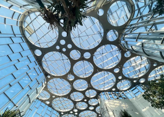 场馆整体立面采用透光率高达92%的超白半钢化夹层玻璃,悬顶玻璃为国内面积最大单片玻璃(≥8.5m²),总面积达1万平米,“不规则多边形”网格的分割,扩大了采光的可用面积,更好地满足植物的光照需求。
