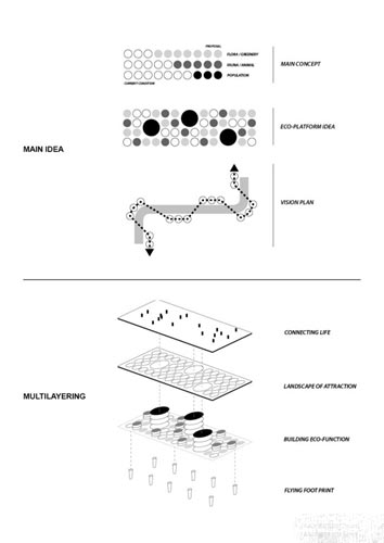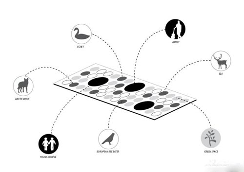 方案的“生态平台”规划不仅会给城市居民带来益处,同时会增加游客游览的市中心自然景观。平台的其他优点包括在未来洪水来临时,设计了一条逃生通道。此外,提供欣赏布拉格优美风光的城市观景台,关注对象集人类、花卉、动物为一体。
