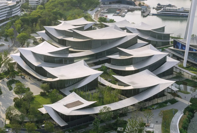 设计理念根植于苏州园林传统,从“廊”、“亭”、“院”中汲取灵感,将体量拆解为九个独立的展馆,再通过通透的玻璃廊道优雅串联,编织出一个庭院与展厅交织的游览网络。建筑如植物根茎般向湖岸延伸,创造出一步一景、移步换景的沉浸式艺术体验。