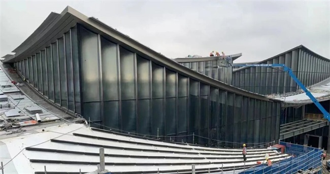 建筑幕墙采用国内首例双银Low-E超白弯弧玻璃。起伏的屋顶与回廊则由暖色调不锈钢面板精密打造,远观连续平滑,近看如折纸般纤薄。