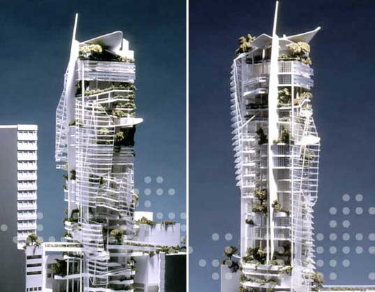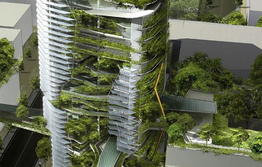 事实上,这座大厦所处场地是城市中一个的“零文化”区,而且生态系统基本破坏殆尽,只有一点原始的土壤和植被。为此,大厦形成一个有机体,继承并平衡了场地原有的生态要素。立面和平台都种植了常绿植物。这些种植区域是连续的,并以相连的景观坡道向上连接到最高层。建筑内的种植面积达到了3841m2,总的使用面积为60331m2。设计初始阶段,建筑师详细绘制了本地植物在一英里范围内的分布图,并确认适合在大厦上种植的种类不会与本地物种产生冲突。