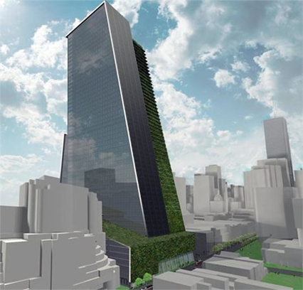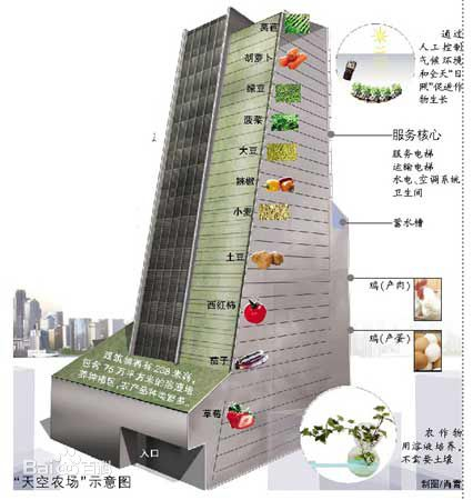 加拿大科学家戈登·格拉夫提出建一座58层高的概念性建筑——“天空农场”的计划,将在多伦多市中心种植农作物,每年产出的食物可满足35000人一年的需求。尽管这可能并不能满足多伦多市区所有人口的粮食需求,但这毕竟是个开端。在“空中农场”设计方案中,这栋55层的建筑表面覆盖一层植被。这种水耕农场通过燃烧自身的农场废物进行发电,产生的能量可以满足整栋建筑50%的能源需求,而另一半的能源则来自城市废物。