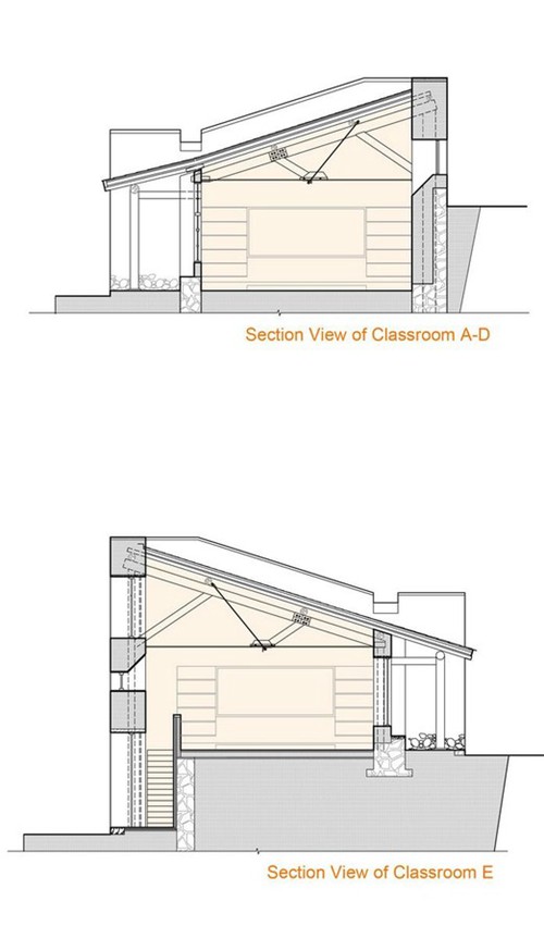 顺应地形,学校所需的十间教室被分为五个单元,布置于两个不同标高的台地之上,使得每间教室均能获得尽可能多的日照和夏季自然通风。以绿化为主的院落环境有助于为孩子们创造一个舒适愉悦的校园环境。教室的造型源于当地传统木结构坡屋顶民居,不仅继承了传统木框架建筑优良的抗震性能,而且对于村民而言更容易建造施工。教室北侧嵌入台地,可以在保证南向日照的同时,有效地减少冬季教室内的热损失。宽厚的土坯墙、加入绝热层的传统屋面、双层玻璃等蓄热体或绝热体的处理方法可以极大地提升建筑抵御室外恶劣气候的能力,维护室内环境的舒适稳定。与此同时,根据位置的不同,部分窗洞采用切角处理,以最大限度地提升室内的自然采光效果。