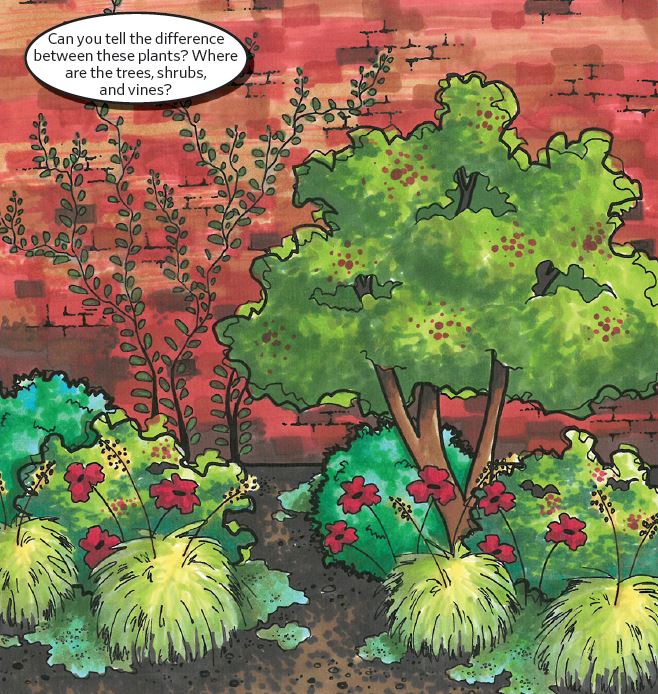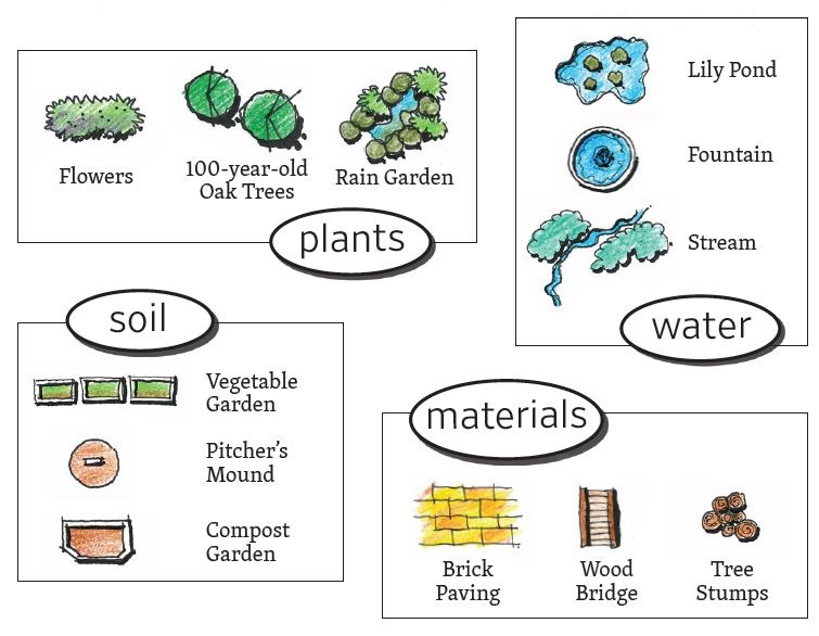 从平面图上,你们看到了什么?有哪些种类的植物、土壤、水和建筑材料?