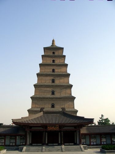 大雁塔位于城南雁塔路顶端,曲江风景区之北的慈恩寺内。该寺是唐高宗李治为追念他的母亲文德皇后修建的皇家寺院。始建于永徽三年(公元652年),寺成不久,唐高宗令高僧玄奘移住寺内译经。玄奘为保藏佛经请求在寺内建塔。仿西域佛塔形式,名曰"雁塔"。高64米,共七层,每层都能凭栏远眺四方:北面的西安城区;南面的曲江风景、终南山,可以尽收眼底。此塔较荐福寺塔大,故称大雁塔。唐代学子考取进士后,都要登上雁塔赋诗并留名于雁塔之下,号称"雁塔题名"现雁塔底层还保留有唐代线刻画,唐太宗、唐高宗的《大唐三藏圣教序》碑和《述三藏圣教序记》碑。
