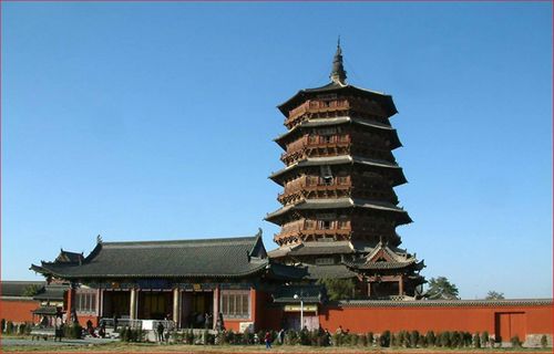 应县木塔即佛宫寺释迦塔,俗称应县木塔,在山西应县城佛宫寺内。辽清宁二年(1056年)建。塔平面八角形,外观五层,夹有暗层四级,实为九层。总高67.13米,底层直径30米。是国内外现存最古老最高大的木结构塔式建筑。