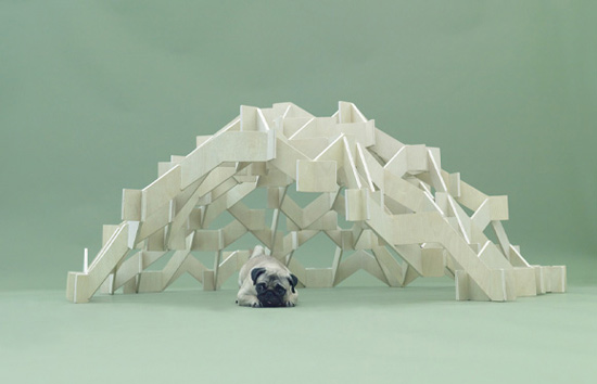 这座建筑是一个网状的山,以600mm“细而长组件(胶合板)片为“分支”,形成一个个不均匀性的六边形或者三角形,“分支”相互支撑,犹如生物的细胞。它不需要钉子就可以获得足够的力量。巴哥犬很聪明很淘气,它利用网格作为它的巢和玩物。有时候还可以把玩具和零食也挂在网格上。