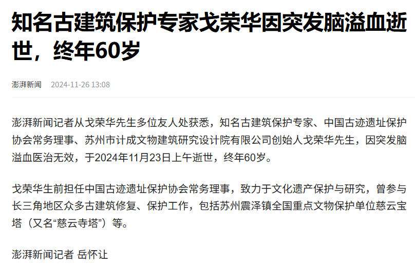 知名古建筑保护专家、中国古迹遗址保护协会常务理事、苏州市计成文物建筑研究设计院有限公司创始人戈荣华先生,因突发脑溢血医治无效,于2024年11月23日上午逝世,终年60岁。