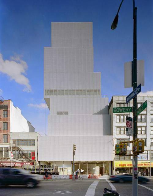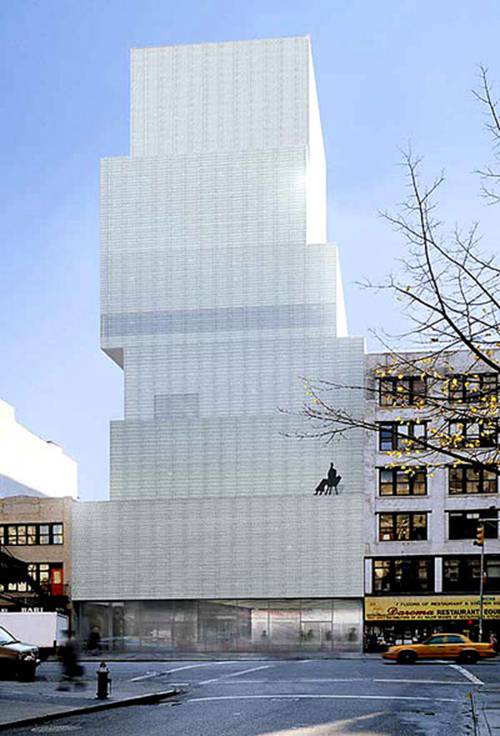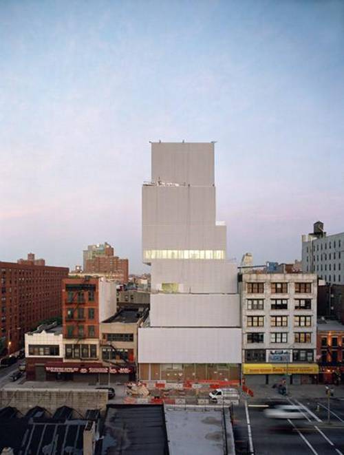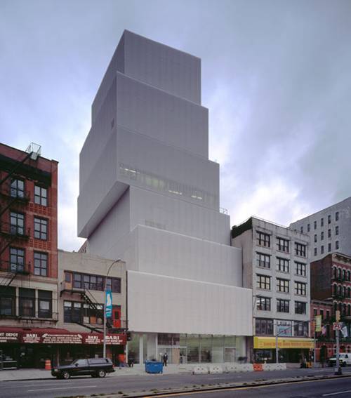 新当代艺术博物馆由日本建筑师妹岛和世、西泽立卫共同设计,位于纽约曼哈顿下区,采用了6座矩形盒子结构叠加的形式,使大厦外形就像随便叠上去的积木,每一座盒子都有不同的楼层面积和天花板高度,这是为了营造更加开放、灵活的展览空间。