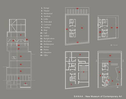 新落成的博物馆占地6万平方英尺的总预算为5000万美元。犹如六个错落的盒子堆砌而成的博物馆在曼哈顿街头提醒着在此过往的人们,纽约不只是一个物质生活的天堂。妹岛和世的设计常有其师伊东丰雄的影子,努力抛弃建筑给人的沉重稳实感。故而建筑外立面较多运用具通透感的材质。纽约新当代艺术博物馆也同样如此。总共七层楼高的博物馆由六个银色镀铝的金属网格材质的盒子叠加而成,从外表上几乎看不到窗户。六个盒子内部事实上为六个不同主题画廊,故意朝向不同方位,代表着艺术世界内终日各立一个山头的现状。