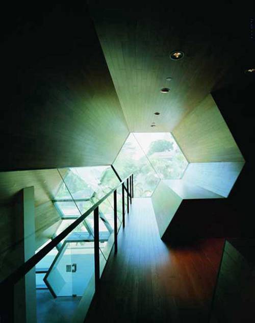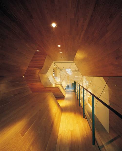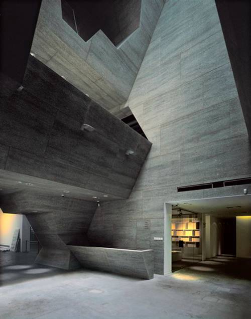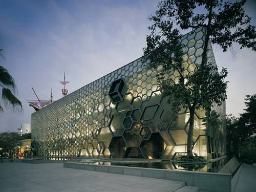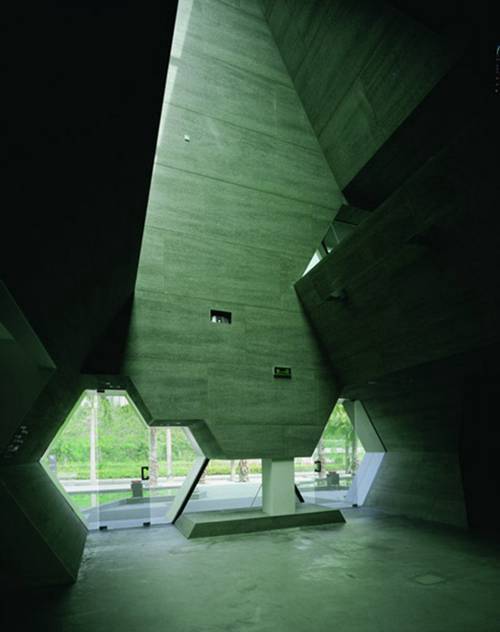 虽是邻近的国家级美术馆展览空间的延伸,但酒店展馆的特殊定位,决定了改造后展馆的独特性:其设计既要突显个性,与两边建筑风格形成差异性对比,同时也要体现与两端建筑的关系及整体性。改造策略完整地保留了原建筑立面的窗墙体系,加建的立面通过包裹的手法,将单一的原始六边形通过复杂有机的组合形成由实至虚、由小到大和多层次渐变的三维视觉效果,从而,在车辆由西至东快速通过的瞬间,形成强烈的视觉冲击,通过立面结构的缩小放大,逐层递减,如同面纱般轻轻揭开,最终透出原建筑立面的戏剧性变化过程。 展馆的室内设计再次运用立面所含有的六边形元素作为基本平面形态,在竖向上作90°的拉伸,形成一系列折叠平面互相交叉、互相切入构成的复杂但带着明确功能元素的公共空间。这种表达形式改变了原本单调的立面几何图案,用三维方式生成新的室内空间,这种“突变”形式使设计产生了不可预料的惊喜结果。这个旧洗衣房的华丽转身,也折射了深圳这个城市从早期的工业城市向当代国际大都市的转变。