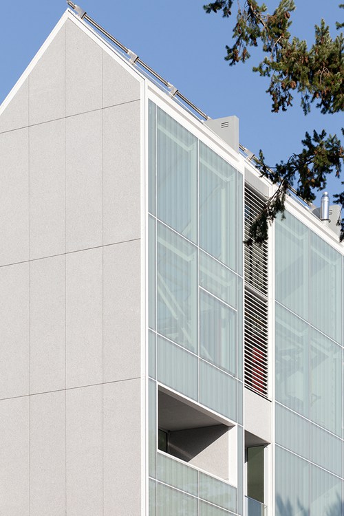 弧形玻璃是建筑的关键所在,它使得建筑的屋顶、立面和入口长廊之间形成没有边界的过渡,从酒店正面看过去,一气呵成的立面宛若流水倾泻而下。建筑表面上细分的格子就代表内部房间的划分,建筑的背立面(南立面)也使用了这一极具特色的手法。相对于南北立面的玻璃,酒店的山墙表面则使用了大块的花岗岩石板,简单质朴。