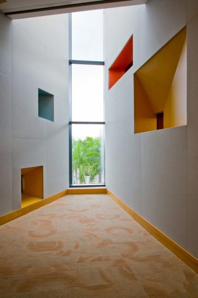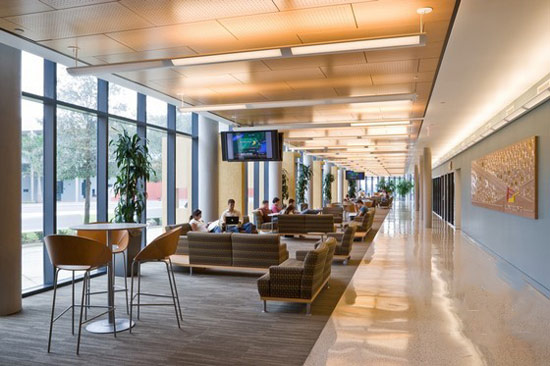 KPF Architects设计的美国查普曼商学研究部由教室、办公室、多功能活动厅、300座讲堂和供学生自由支配的空间构成,建筑的一大特色是景色优美的中庭,中庭同时也是穿过重重空间的一条对角通道,能够让东西方向的微风吹入,建筑的整体格局呈现出庭院首尾相连的几何形状。设计主旨意在促进学生、教员及行政人员之间的互动交流.同时保证他们各自所需空间的独立性。