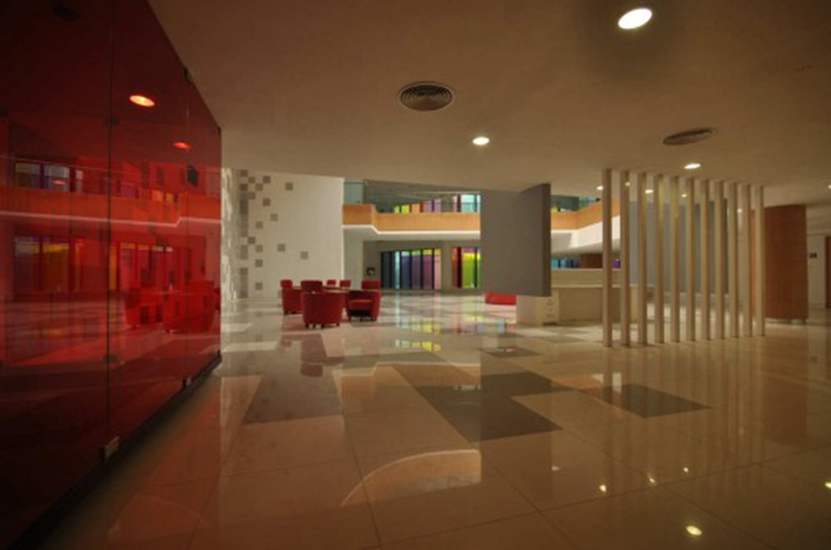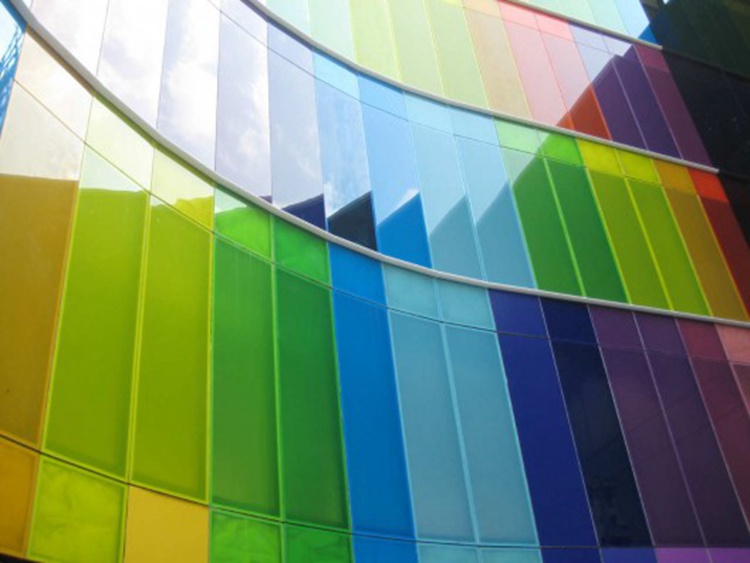 自然总是以它不断变幻的形式成为人们设计的灵感来源,天空就是一个例子,它不断变化的颜色和状态就是这个设计表皮的灵感来源。彩色的叠片加上PVB玻璃使建筑表皮生动活泼,上面的样式也是非重复的,它象征着捉摸不定的天空,也表达着年轻人的无限活力。