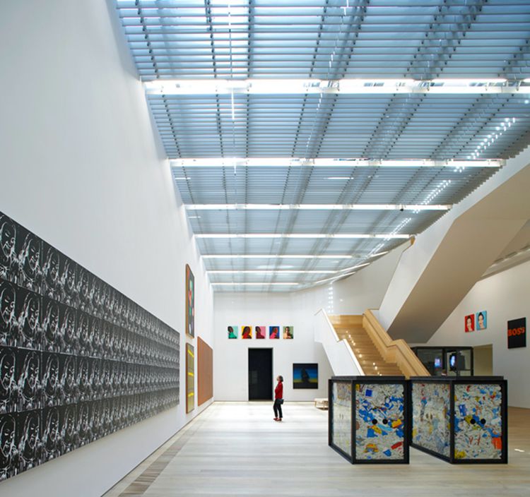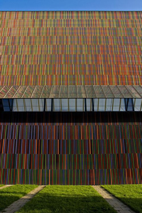 建筑的外立面被打造成一座充满生机的艺术品,直接向人们昭示它的固有功能——这是一座艺术博物馆。在这个意义上来说,建筑师五彩斑斓的设计更像是一幅大型抽象画。这层建筑表皮体现出建筑师对该馆体量的理解和可塑性的表达。通过不同色块的区分,整个建筑外表面被分为三个彼此联结的体块,分别代表三个不同的展区。