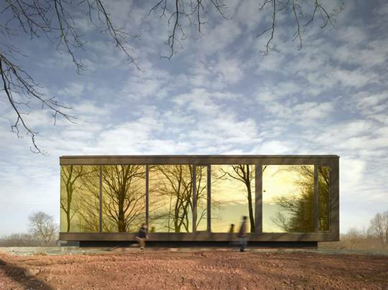 浴室和壁炉这些功能空间就位于房子的垂直方向上,这样就给外墙带来了自由,隐私的空间安排在封闭的外墙内,而其他则是大玻璃墙,如上图所示的金色玻璃倒影了周遭的风景,给内部也带来了巨大的视野。轻钢可预置结构可以削减建筑成本,混凝土和玻璃融合这个连续的几何,带来个性和良好的空间。