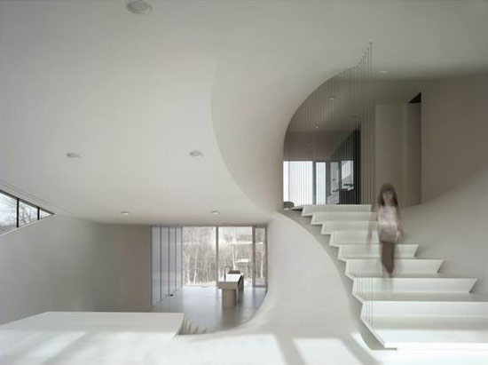 在分叉的交接处就形成丰富的空间变换(连续,贯穿),空间的分割由5个平行的扭曲面来完成。最底层是厨房和餐厅,流畅的提升到上面一层的活动区,而且1米5的高度变化可以给你一个巨大的视野看到外面的山谷。同样活动区流畅的提升到最上一层,是主卧和小孩的卧室。