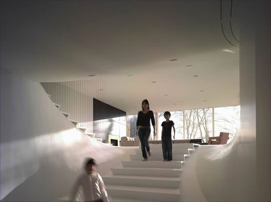 VilLA NM是UN Studio 2006年的设计,也是他们在美国的第一个建筑(纽约郊区)。VilLA NM是一个300平米四口之家的别墅,建筑外形是分叉的盒子,北面的分叉依偎在斜坡上,另外一个从一段开始提升,即上图看到的右边部分,下面就形成一个车库的空间。