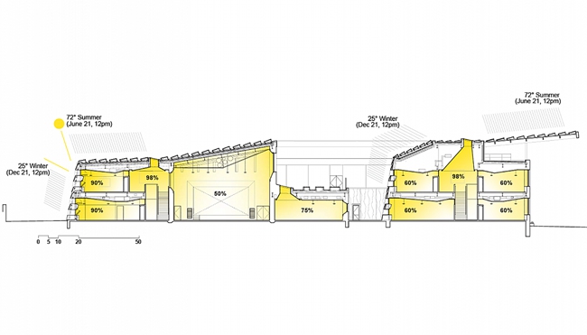 SOM优化了这座由庭院塑造的建筑的朝向和体量,以此充分利用日照来获得良好的采光以为屋顶和南立面上的光伏电板阵列提供能源。其它在设计中采用的可持续和低能耗措施包括超紧密的高性能建筑外墙、天窗采光走廊、节能照明装置、低能耗厨房设备、暖房和蔬菜花园、地热交换系统、能量回收型通风设备、按需控制通风和太阳能热水供应系统。