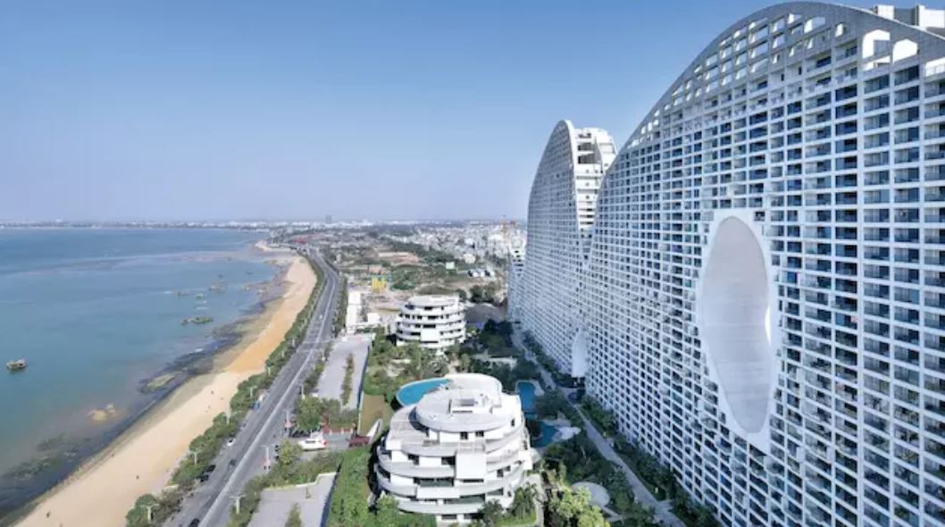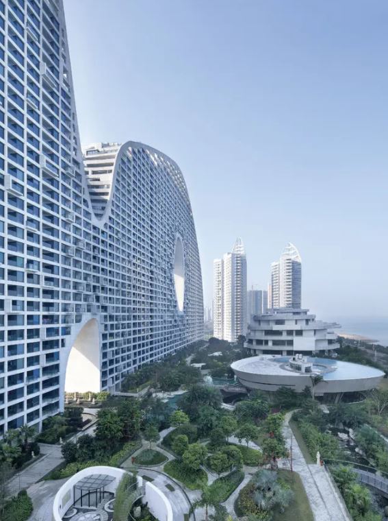 由马岩松设计的北海北部湾一号项目面积达50万平米,包含八座塔式建筑,东侧高达192米的五星级酒店式公寓。项目整体抬高8米,一线海景设计;采用以曲对直手法,自然起伏呈波浪状的园林环境。