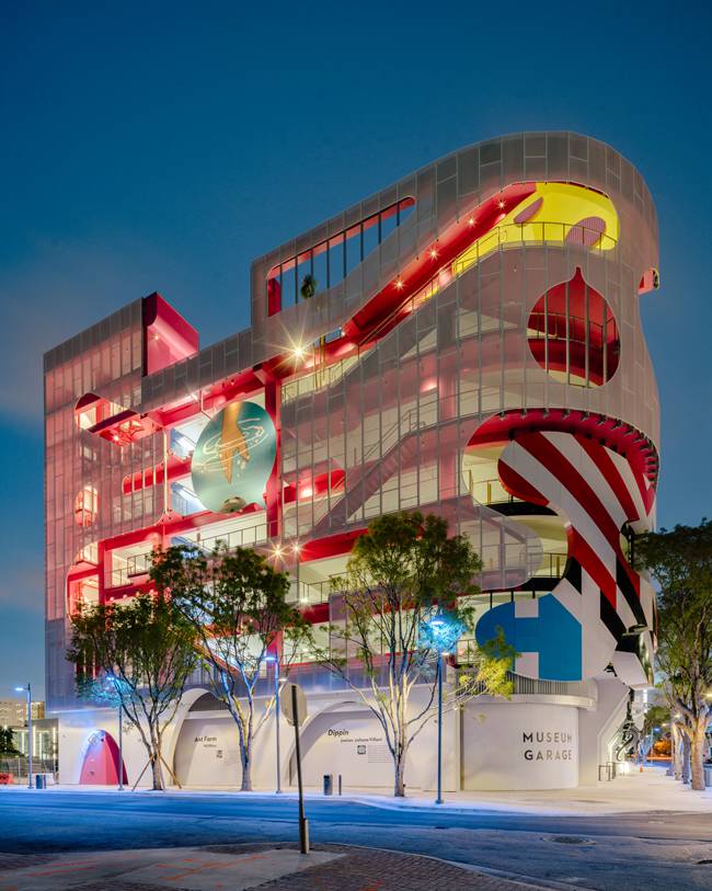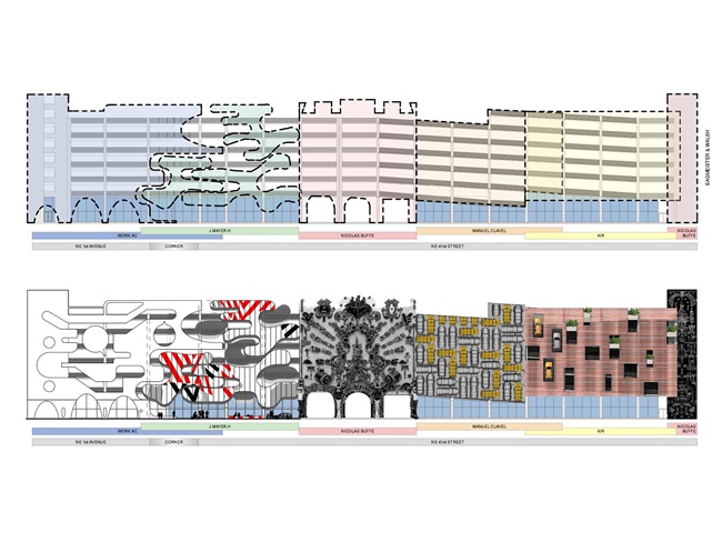 博物馆停车楼位于迈阿密设计园区,这是一个致力于创新艺术、设计和建筑的社区。 该项目由5名设计者合作,7层楼的综合体将包括地面层零售空间和800个停车位。2015年,设计园区的开发者 Craig Robins,委托建筑师和策展人 Terence Riley 发展博物馆停车楼的概念。WORKac, J. Mayer. H, Clavel Arquitectos, Nicolas Buffe和 Riley 自己的建筑公司 K/R (Keenen/Riley) 共同设计停车楼的立面—— Exquisite Corpse(文字游戏)。
