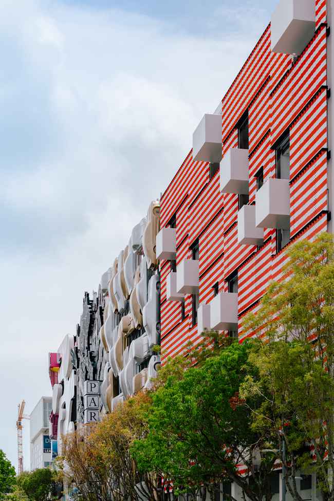 Clavel Arquitectos 的作品是城市堵塞。位于 Nicolas Buffe 的立面和 K/R 的立面之间,西班牙公司 Clavel Arquitectos 的作品城市堵塞是迈阿密设计区城市生活的再生——在这里建筑和城市设计使老建筑和废弃的空间重新焕发生机。城市堵塞暗示着相似的对于熟悉元素的“再利用”,使用45个忽视地心引力的用金属和银制成的车身。 实际上,这种过去的风格作为雕塑的对象获得了第二次生命,仿佛陷入超现实的垂直交通堵塞。在41街最西面的地方,当代艺术学院的对面,是由纽约和迈阿密的 K/R设计的路障。这个设计受到迈阿密汽车景观的启发,尤其是无处不在的成色和黑白条纹的交通障碍。在这个项目中,这些人造路障会向右翻转,形成一个色彩明亮的屏幕。立面有15个用镜面不锈钢制成的“窗”,混凝土植物从人行道上冒出来。