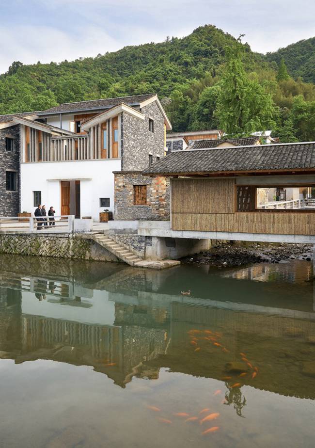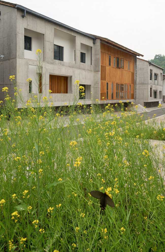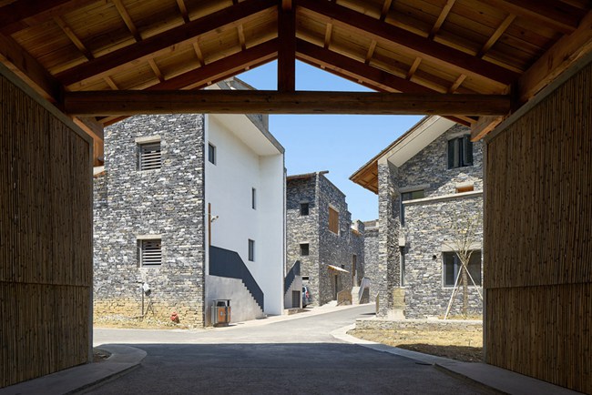 洞桥镇文村美丽宜居示范村:这是王澍主持设计的第一片农居群落。从2012年开始,他和同是建筑师的妻子陆文宇一趟趟地奔向这个名不见经传的小村庄,用灰、黄、白的三色基调,以夯土墙、抹泥墙、杭灰石墙、斩假石的外立面设计,呈现他理想中的美丽宜居乡村。屡获国际建筑大奖殊荣的王澍坦言,为村民设计农居并获得他们认可并不容易,因为这是在新型城市化的大背景下,寻回乡村传统和意义的过程。