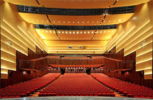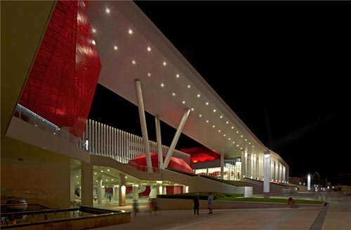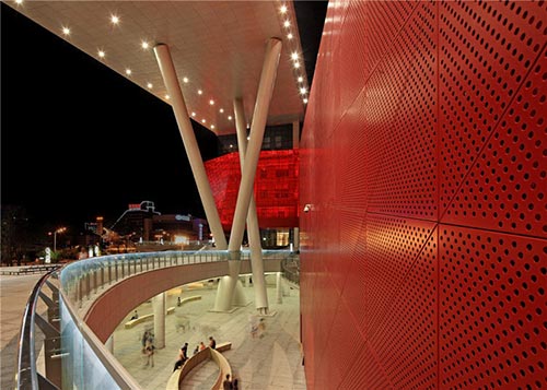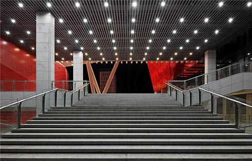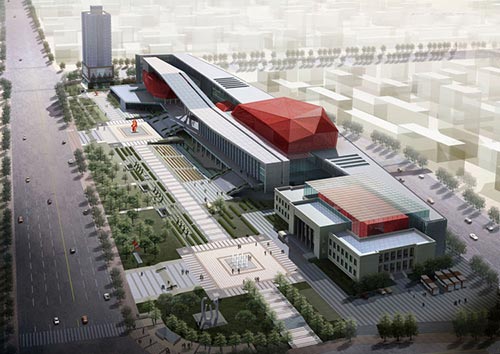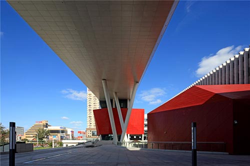 交汇之海、文化之石——将博物馆、大剧院、青少年宫的建筑体量用红色穿孔板包裹,分别意蕴历史之石、现代之石和未来之石。洗练简洁而寓意深刻的形体下包含了丰富、多层次的内外部空间,形成山海仙境、开放烟台和交汇之海、文化之石的设计意向。