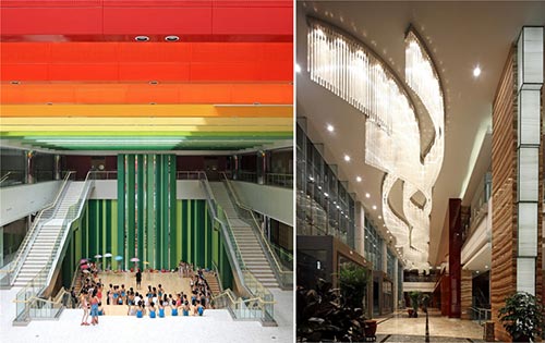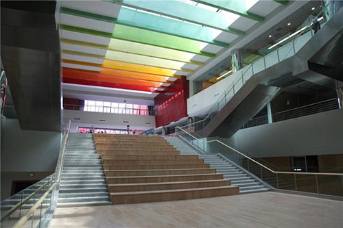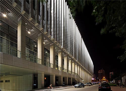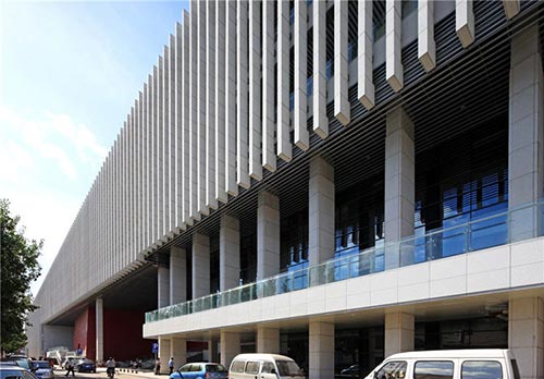 长平流雾、烟绕云台——不同体量以舒展而曲折的飘板、柱廊等连接,形成长平流雾、烟绕云台的空间意象。刚劲挺拔的骨架象征着大气刚健的人文性格,柱廊则是一种弹性的界面,刚柔并济。