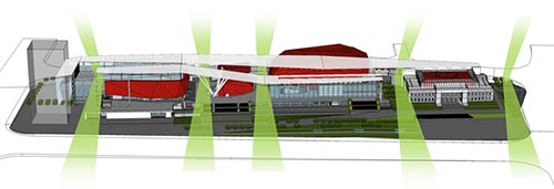 开放通透、生机活力——北面大面积的市民广场以及在大尺度飘板下的立体平台都可作为开放的市民空间,将人流引入到建筑的架空平台内,南北通透畅达,既增强了基地的可穿越性,同时提供适应气候环境的文化活动空间。