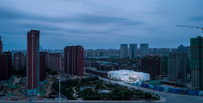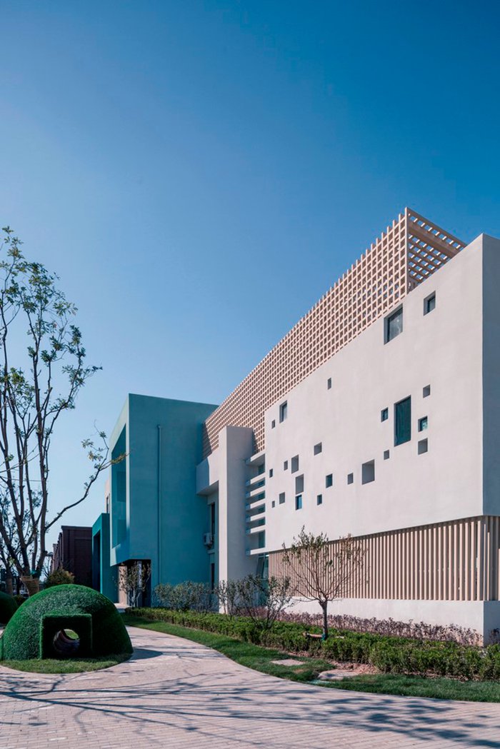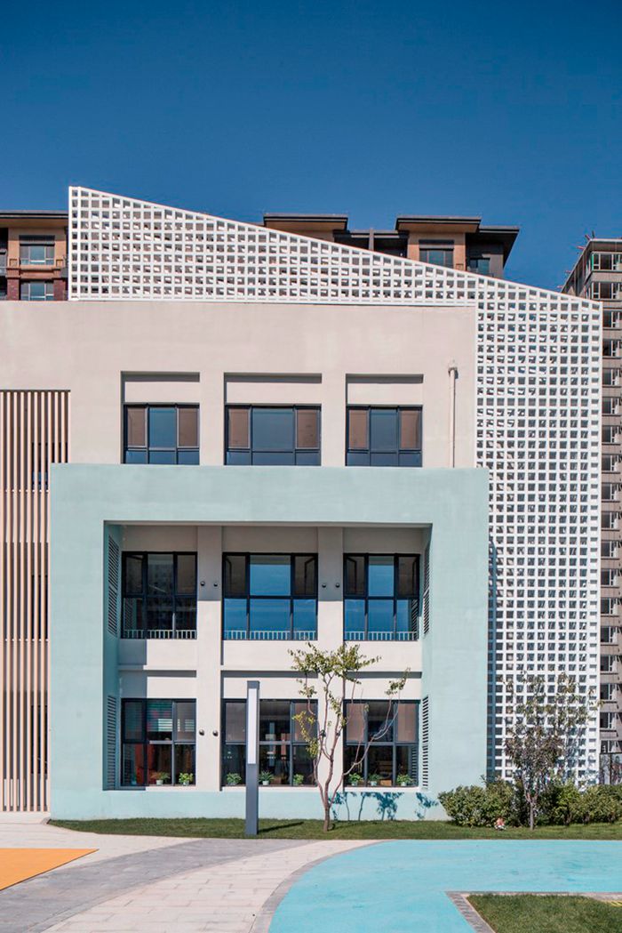 场地周围的小区是高密度住宅,建筑师在建筑处理上尽量弱化场地四周沉重的色调和机理,让幼儿园给社区带来轻快的闪亮的色块。建筑师为建筑表皮局部设置了竖向的廊架,一方面舒缓西北地区日照为室内带来的强烈光线,使得室内获得更柔和的漫射照明,另一方面,幼儿园内部的活动隐约衬托在外立面的表皮上,衬托整个建筑更加轻盈。