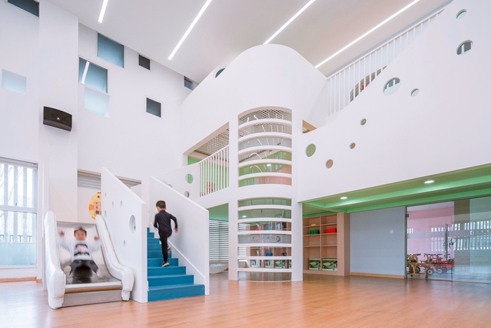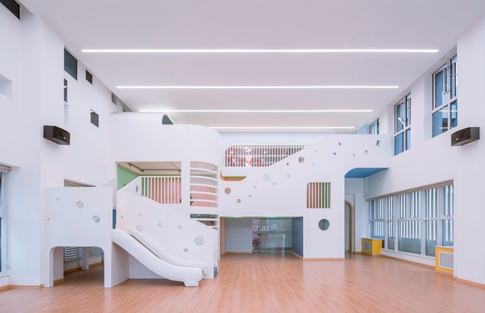 整个幼儿园东南部一层是一个多功能大厅,同时也是对外开放的共享空间,社区里儿童周末和节日参与到这个空间里,家长也能参与其中。利用大厅的一层到二层的交通空间,综合滑梯,蹦蹦床,攀爬,躲猫猫等活动内容构筑出一个大型雕塑装置,在这里孩子们可以自发的玩游戏。同时这也是活动室空间里的视觉焦点,老师和家长可以很好的观察到孩子们的动态。