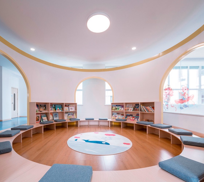 另外,二三层是教学空间,在采用严格的安全保护措施的同时,注重挖掘公共场所的空间潜质,增加了多个把很多孩子聚集在一个的场所,挖掘建筑内部流动性,使其成为随时可以游戏体验与身体锻炼互动体系。教室的走廊设置有圆形的街角阅读,孩子们可以选择不同方向的拱门进入,也可以选择不同的角落阅读。不但刺激孩子们阅读兴趣,又可以大大增加他们和不同年级互动的机会。