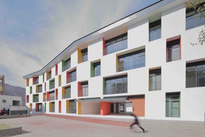 相对于12班幼儿园用地4300m²的建设标准,项目用地只有2490m²,非常紧张。设计首先回应场地面积不足的问题。集约式布局为地面更多的幼儿活动空间提供了可能。12个活动室单元分三层叠放于场地靠学校的一侧,用加宽的走廊联系起来。休息室、音体活动室以一至二层的小盒子的形式,分散插入主体体量,小盒子的顶部成为多个室外场地。首层局部架空成为入口。风沿着河谷吹来,经由建筑体量形成的缝隙轻拂而过。