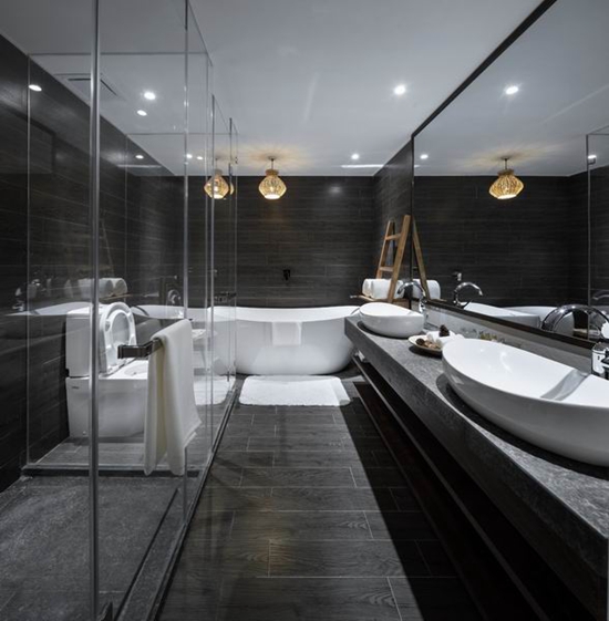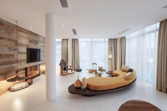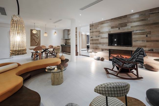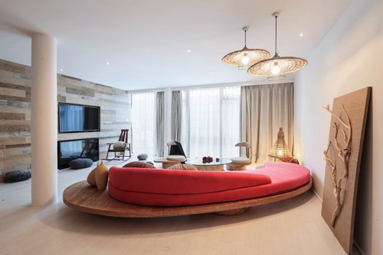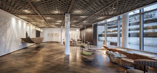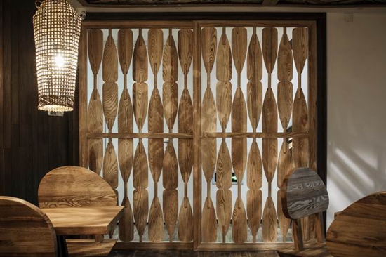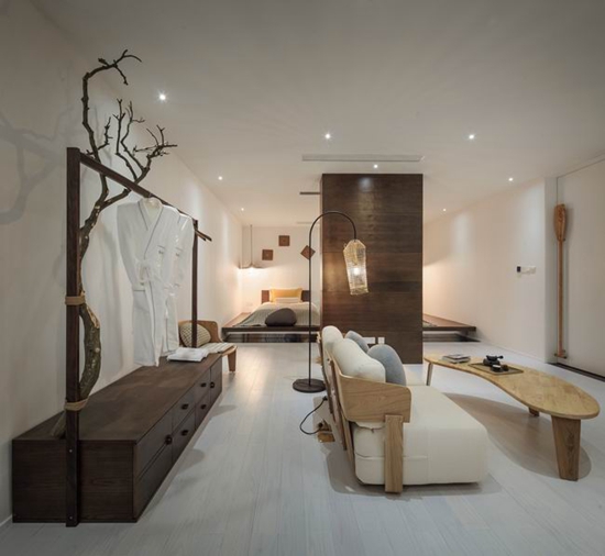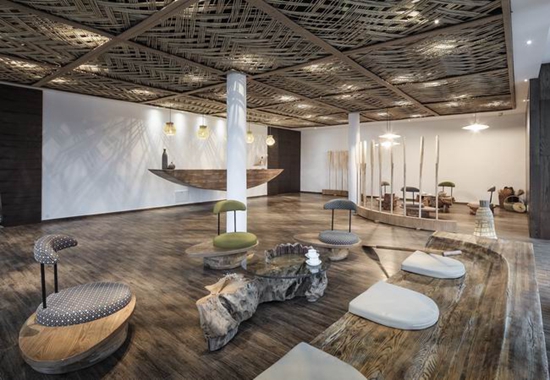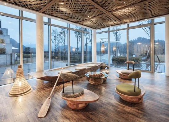 客房里,用以一颗石子触碰水面那一刹那的波动作为沙发的形式出现,涟漪一般的撒出几轮优雅的弧线,便成就了空间里的水的动与静态.我们寻找出一颗树,一支藤,一颗石子,一个鱼娄,经过精细的加工,小心翼翼的放置它们的位置,就像本该出现的出现,填补出整个构图中的主次角色。