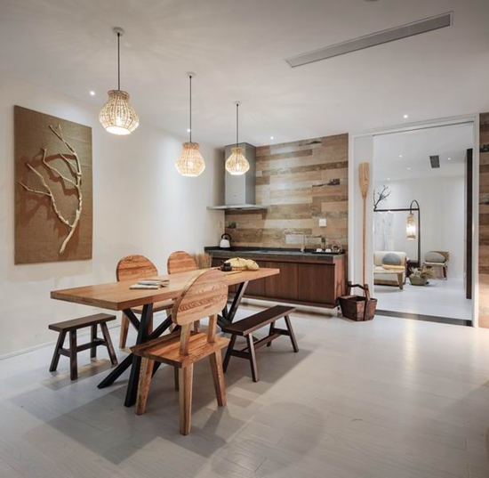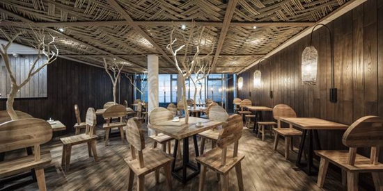 在餐厅里,我们把枯树镶嵌在了桌子上面,结合光影的互动,一副山林便如此。