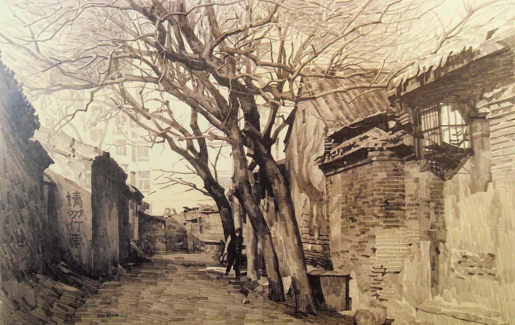这个蓝眼睛北京人保卫胡同的故事,郑希成是在《南方周末》上看到的。在那以后,他也决定加入这场胡同保卫战。他从牙雕厂退了休,决定拿起画笔用自己的方式保卫那些老房子。