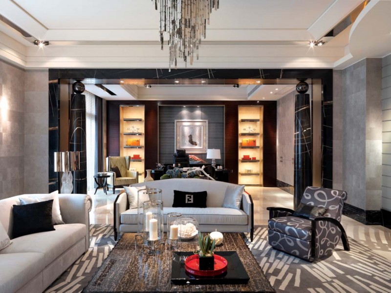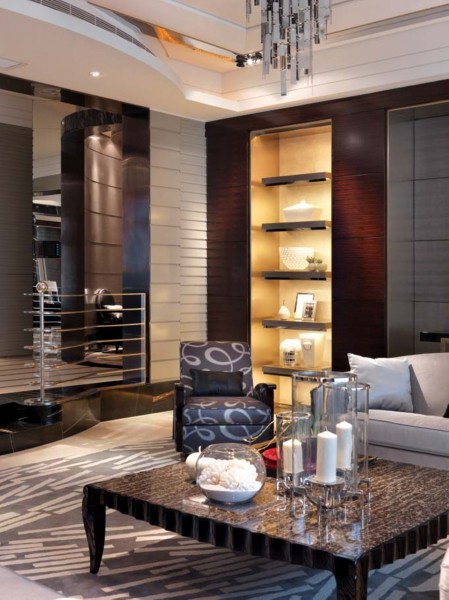 不曾远去的新古典风格,在软装上延续了灰色传奇的使用,随意流畅的灰白线条地毯,简洁黑色洞石茶几,嶙峋的边条增加了茶几的触感,对称与不对称的美在灰黑的夜色中对决。