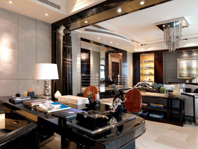 黑金高光烤漆书桌,天然大理石的宏伟触感,坚硬、冰冷的气质如同书房男主人的性格,沉稳、冷静!鳄鱼皮的奢华纹理沙发,属于家中身份尊贵的一家之主专有的桌椅。时尚与古典的相遇,内敛中透出华贵的气韵。